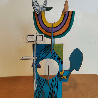 I used a thin cardboard box, which I cut up into shapes. I then used acrylic pens to create colour and design on each piece. Finally I cut small notches in the different pieces so I could link the together and create a stand.