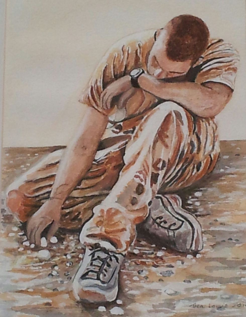 A powerful image with a narrative . Beautifully painted with the marks and scars visible on the arms and the reflective pose of the young soldier. It also makes us, the viewer, reflect on what is happening in our lives.